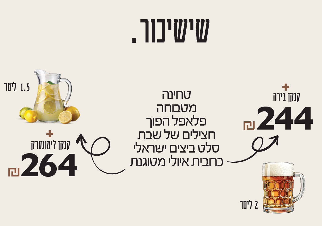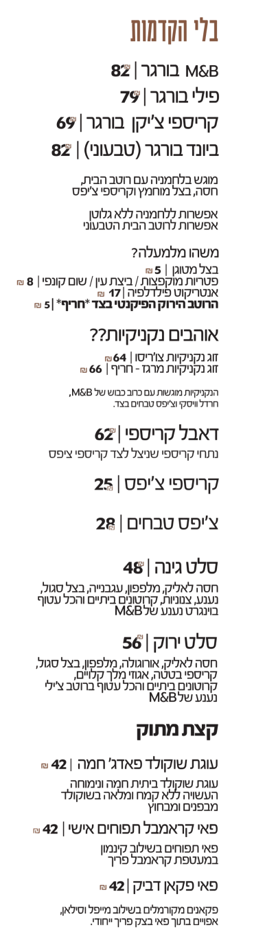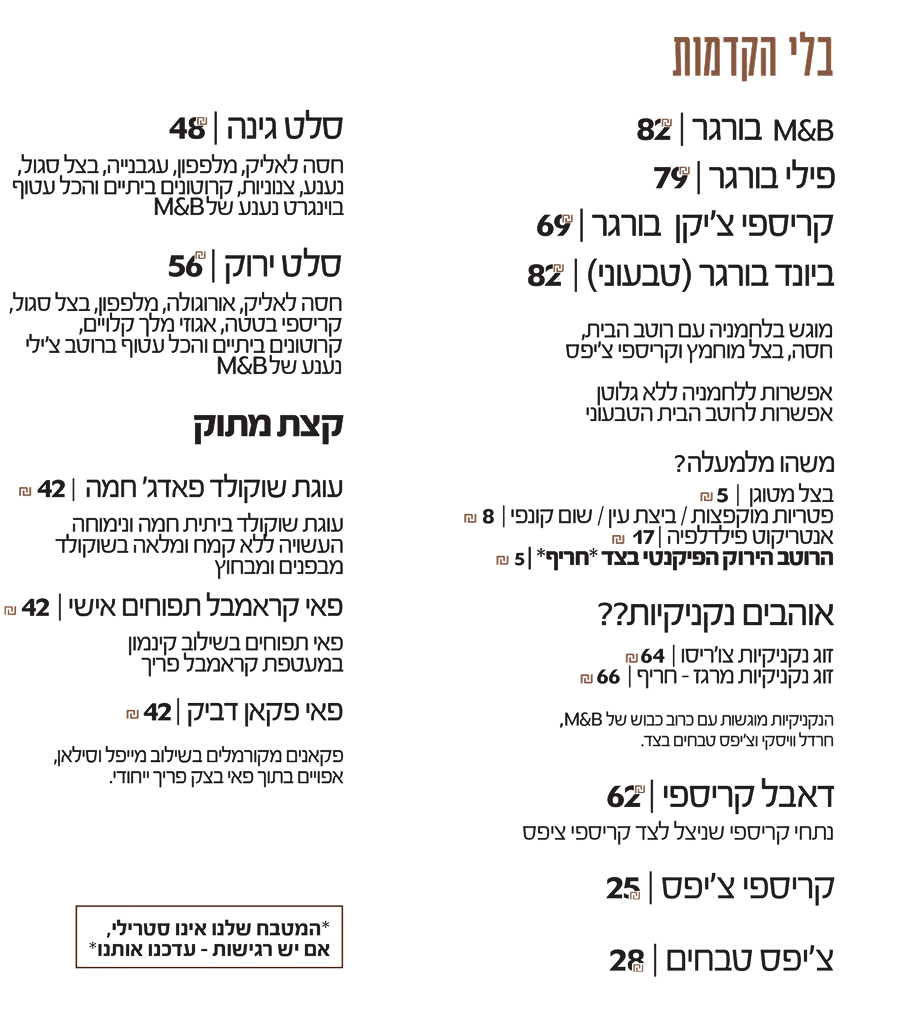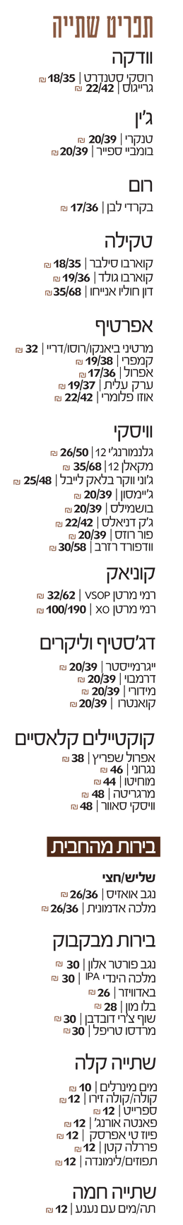 תפריט מופיע למעלה, בנוסף אלכוהול בירה ויין.